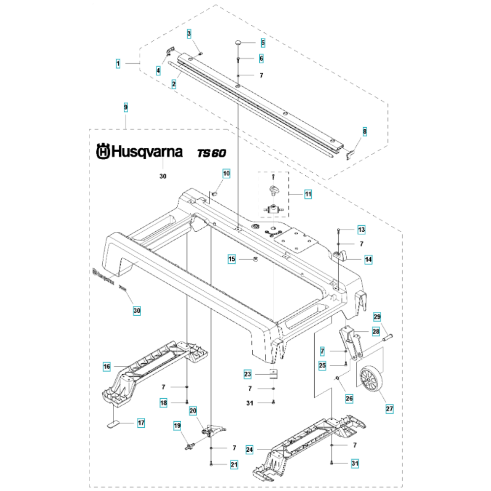 The Frame Assembly for the Husqvarna TS 60 Masonry Saw is designed to provide structural support and stability during cutting operations. This assembly includes components such as brackets, supports, and fasteners, ensuring the saw operates efficiently and safely. Essential for maintaining the integrity and performance of your masonry saw, these parts are available for routine maintenance and repairs.