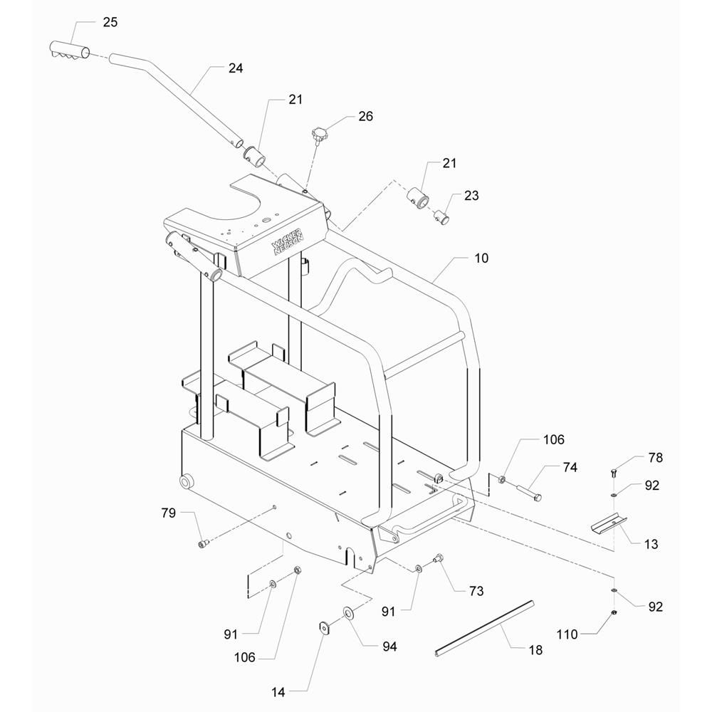 The Frame Assembly for the Wacker BFS 130 Floor Saw is designed to support the machine's structure and ensure stability during operation. It includes essential components such as brackets, mounts, and fasteners, which are crucial for maintaining the saw's alignment and performance. This assembly is vital for both routine maintenance and repairs.