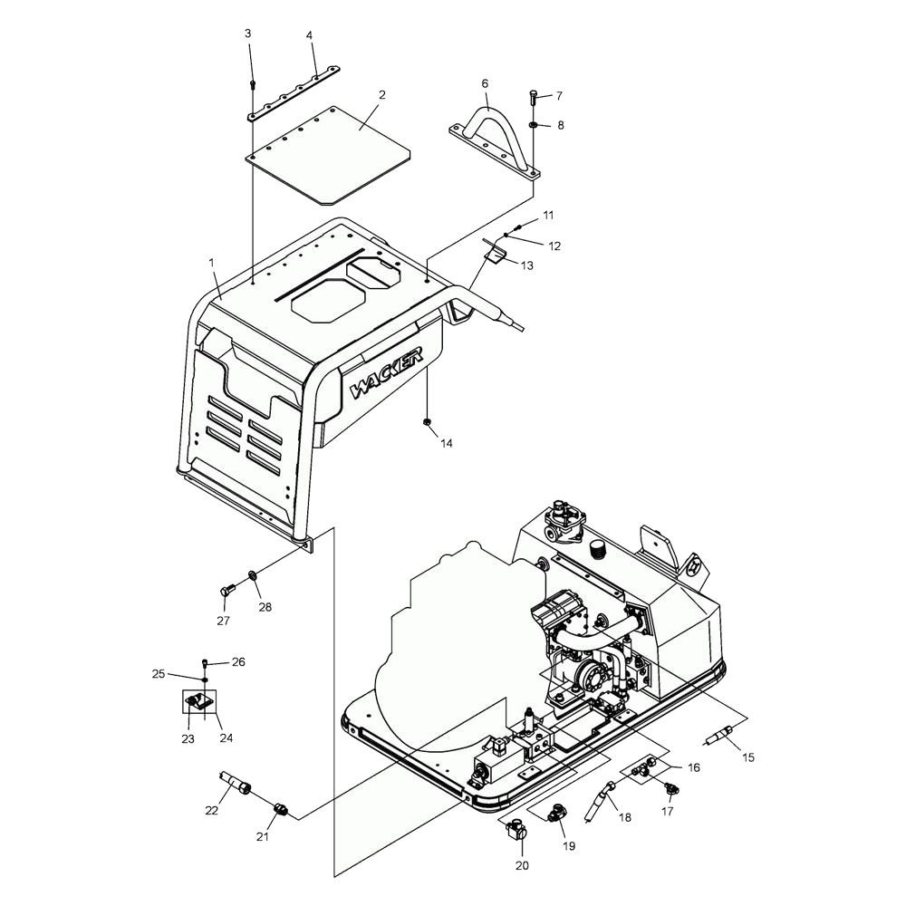 The Frame Assembly for the Wacker DPU9070 Plate Compactor is designed to support the machine's structure and ensure optimal performance. This assembly includes components such as brackets, bolts, and protective covers, which are essential for maintaining stability and durability during operation. Suitable for routine maintenance and repair, it helps in extending the service life of the compactor.