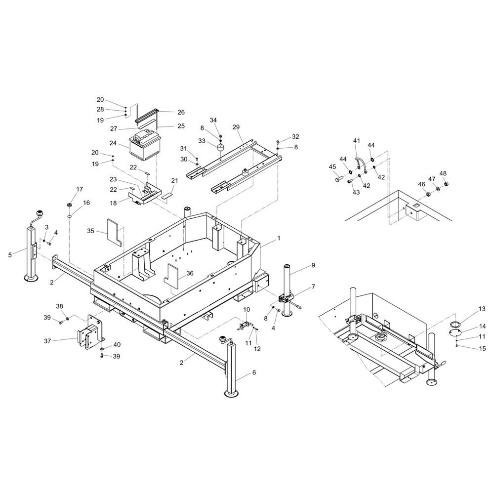 The Frame Assembly for the Wacker LTN4Y Lighting Tower is crucial for maintaining the structural integrity and stability of the tower. This assembly includes components such as brackets, fasteners, and support beams, ensuring the lighting tower remains secure during operation. Designed for durability, these parts help withstand the demands of outdoor environments, providing reliable support for lighting operations.