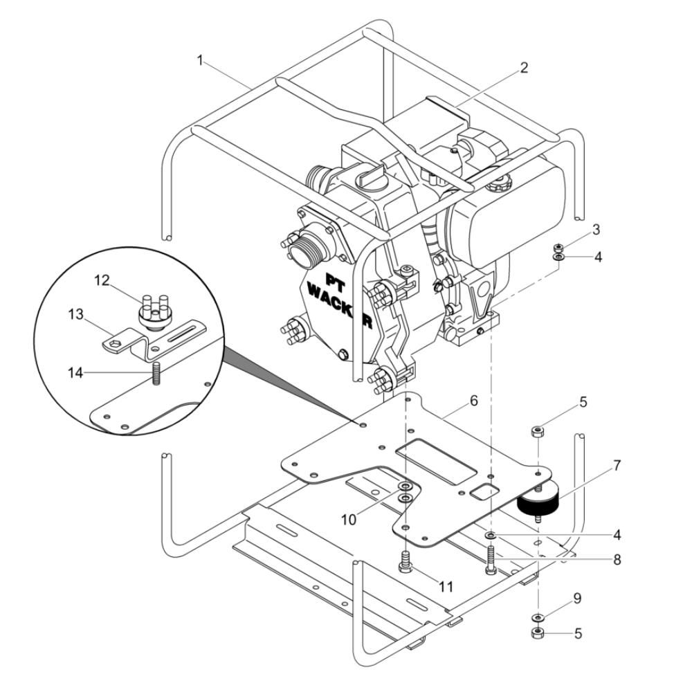 The Frame Assembly for the Wacker PT2Y Pump is designed to provide robust support and protection for the pump's components. This assembly includes essential parts such as brackets, mounts, and fasteners, ensuring stability and durability during operation. Suitable for routine maintenance and repairs, it helps maintain the pump's efficiency and longevity.