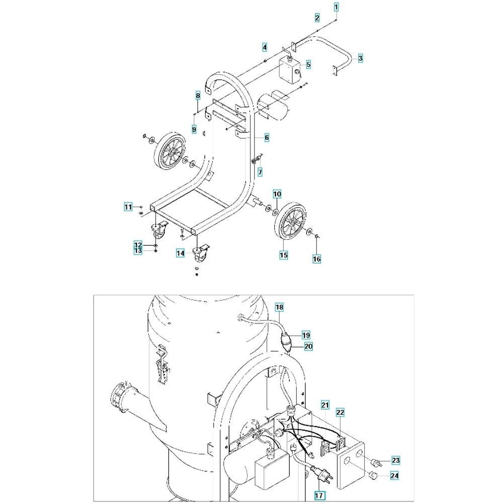 The Frame Assembly for the Husqvarna DC3300 Dust Extractor is designed to support the machine's structure and ensure stability during operation. This assembly includes essential components such as brackets, fasteners, and support bars, all crafted to fit seamlessly with the DC3300 model. Genuine Husqvarna parts ensure durability and compatibility, maintaining the extractor's efficiency and reliability in dust management tasks.
