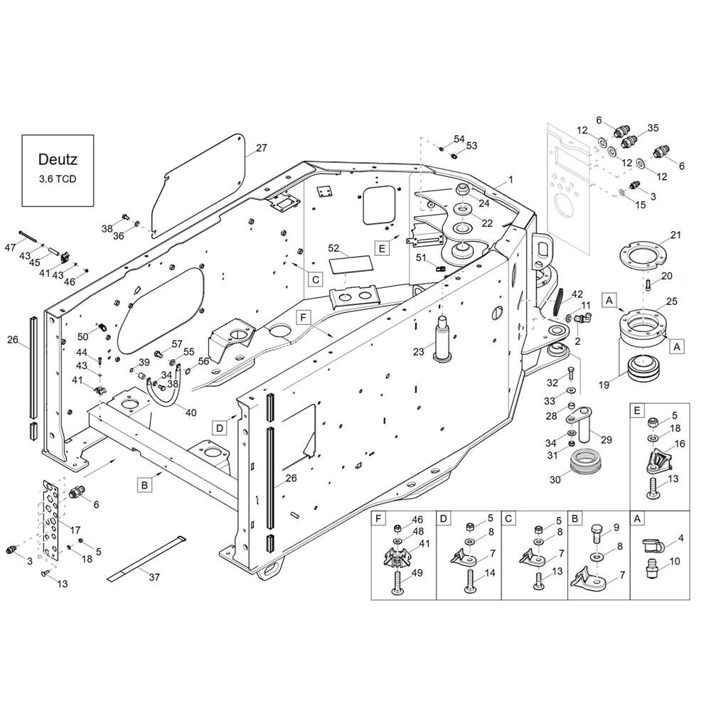 The Frame Drive Unit (TCD 3.6) Assembly is designed for the Wacker DV90-2 Dumper, ensuring optimal performance and reliability. This assembly includes key components such as gears, shafts, and bearings, which are crucial for the efficient transmission of power within the dumper. Genuine Wacker Neuson parts guarantee compatibility and durability, supporting the machine's operational needs.