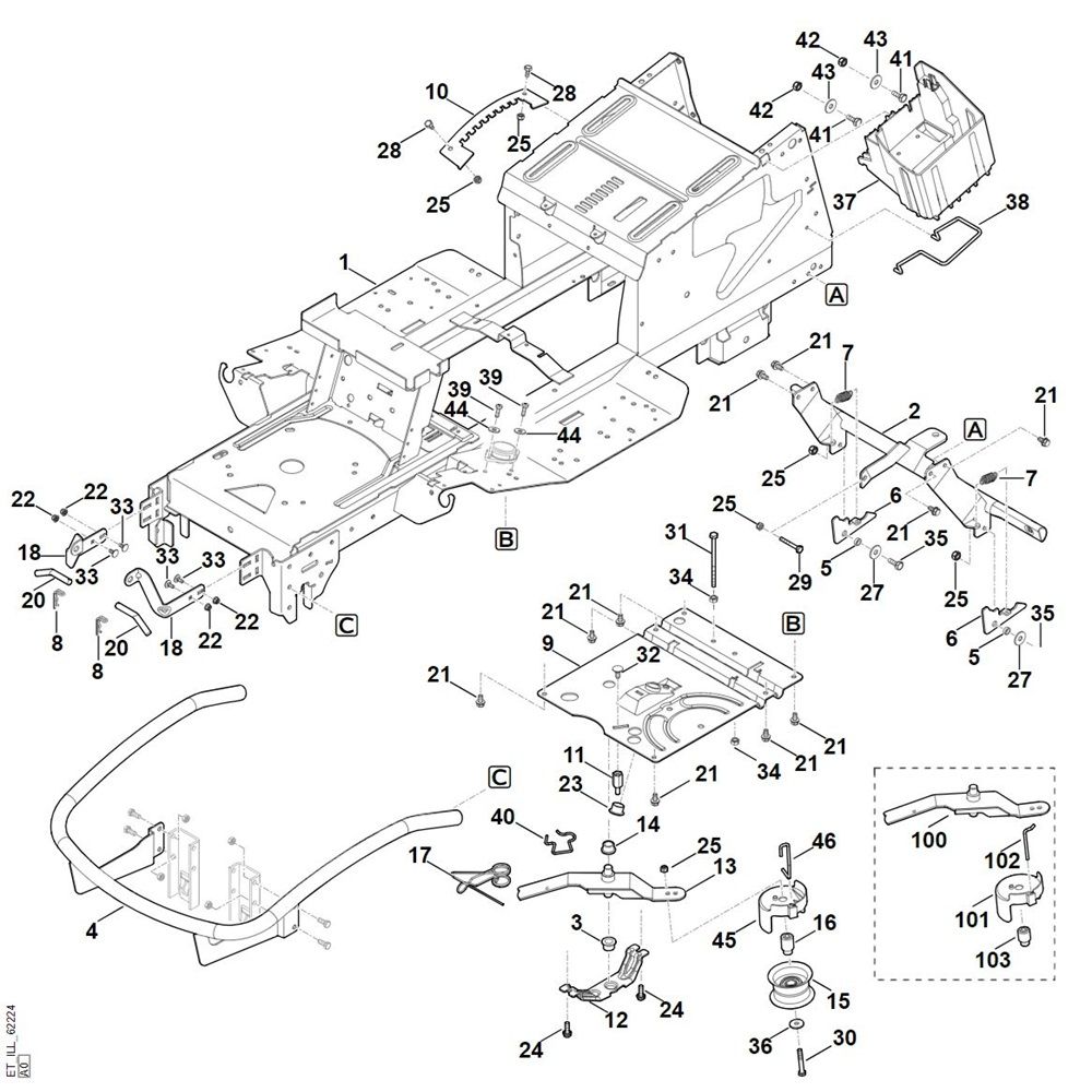 The frame for the Stihl RT 5112.1 Z Ride on Mower is a crucial component, providing structural support and stability. Designed to fit seamlessly with the mower, this genuine Stihl part ensures optimal performance and longevity. It is essential for maintaining the integrity and safety of the mower during operation.