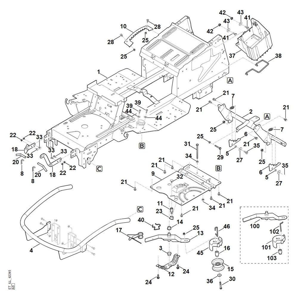 The frame for the Stihl RT 6112.1 ZL Ride on Mower is a crucial component, providing structural integrity and support for the mower's operation. This genuine Stihl part ensures compatibility and reliability, maintaining the mower's performance and safety standards. Ideal for replacements or repairs, it helps sustain the mower's durability and efficiency.