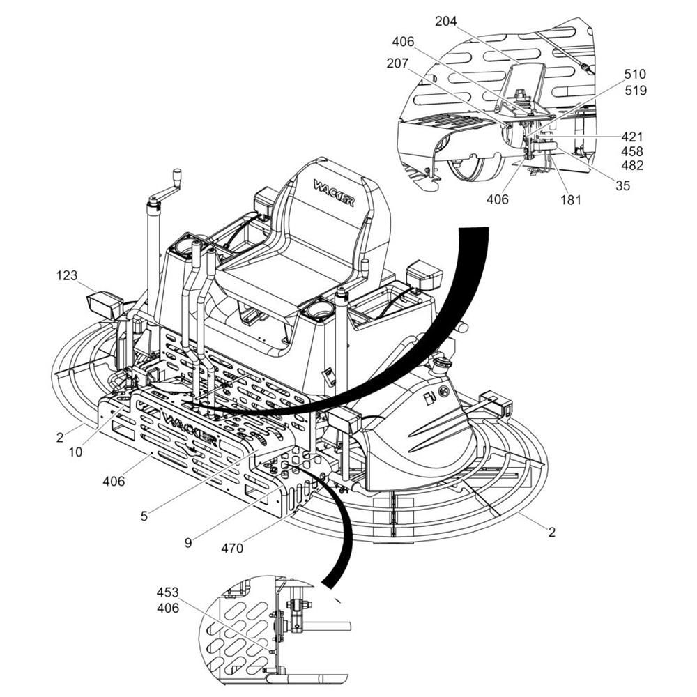 The Frame (Front) Assembly for the Wacker CRT 48-25 Trowel is designed to support the machine's structural integrity during operation. This assembly includes key components such as brackets, mounts, and fasteners, ensuring stability and durability. Essential for maintaining the performance of your Wacker Neuson Ride-On Trowel, it helps in achieving smooth and efficient concrete finishing.