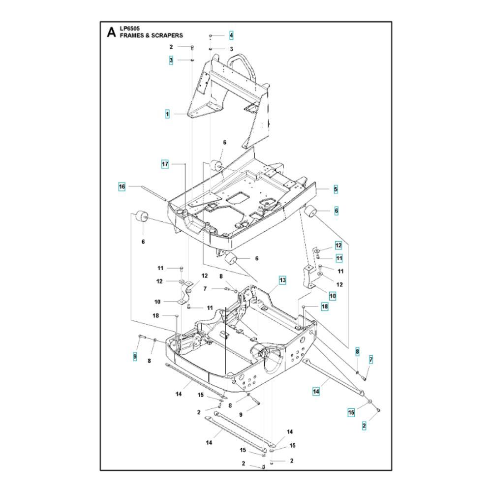 The Frame and Scraper Assembly for the Husqvarna LP 6505 Roller is essential for maintaining optimal performance. This assembly includes components that ensure effective operation and longevity of the roller. Designed for durability, it helps in managing debris and maintaining the roller's surface contact. Genuine Husqvarna parts ensure compatibility and reliability.