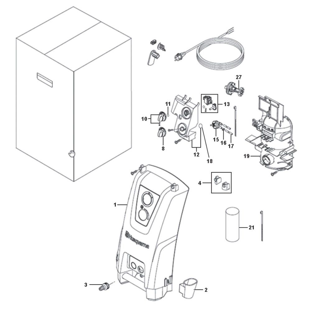 The Front Assembly for the Husqvarna PW 490 Pressure Washer includes key components essential for optimal operation and maintenance. This assembly ensures efficient water flow and pressure management, contributing to the machine's performance and longevity. Components such as nozzles, hoses, and connectors are available, providing reliable solutions for various cleaning tasks.