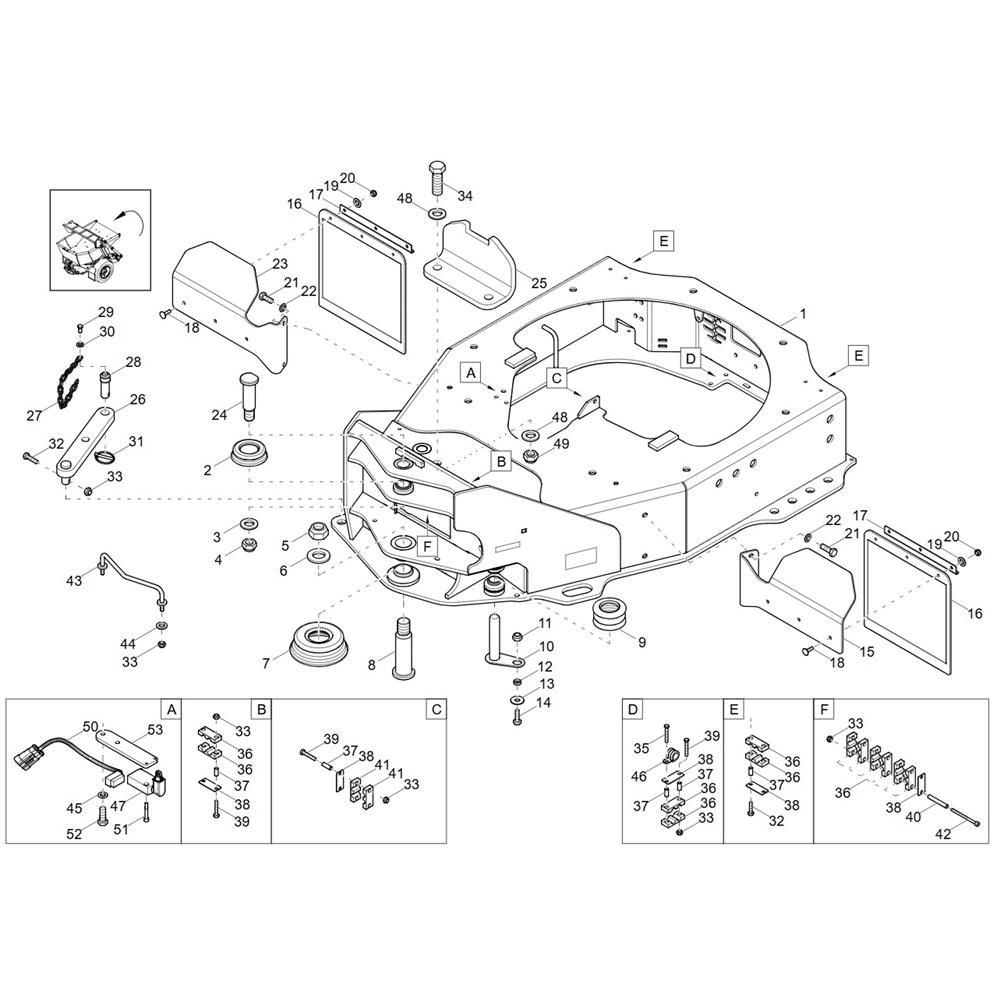 The Front Frame Assembly for the Wacker DW20-2 Dumper is designed to support the structural integrity and functionality of the machine. It includes essential components such as brackets, mounts, and fasteners, ensuring stability and durability during operation. This assembly is crucial for maintaining the dumper's performance and safety standards.