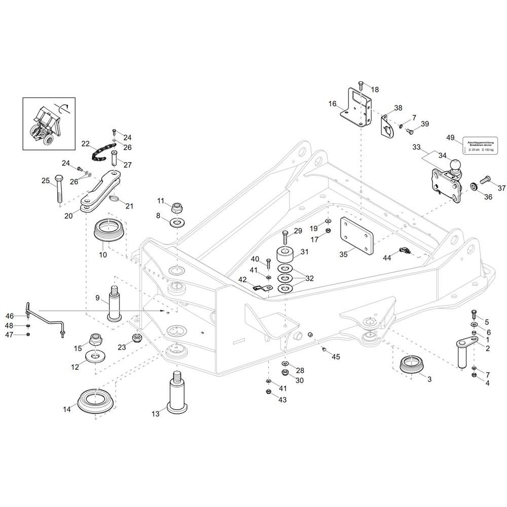 The Front Frame Assembly for the Wacker DV90 Dumper is designed to support the structural integrity and functionality of the machine. This assembly includes components such as brackets, mounts, and reinforcements, ensuring the dumper operates efficiently and safely. Genuine Wacker Neuson parts are used to maintain high standards of durability and performance.