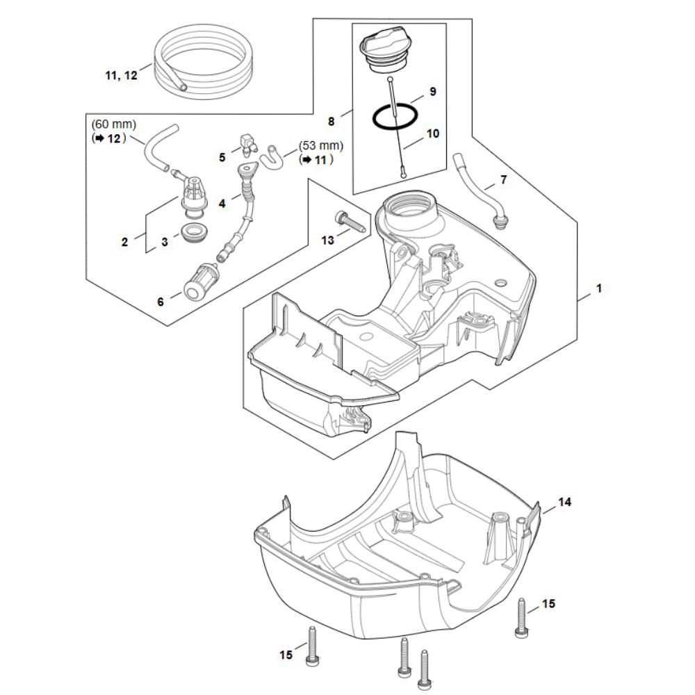 The Fuel Tank Assembly for Stihl FS 361C Brushcutters is a genuine Stihl part designed to ensure optimal fuel storage and delivery. This assembly includes components such as the fuel cap, hoses, and seals, which are essential for maintaining the efficiency and reliability of your brushcutter. Suitable for routine maintenance and repairs, it helps prevent leaks and ensures consistent performance.