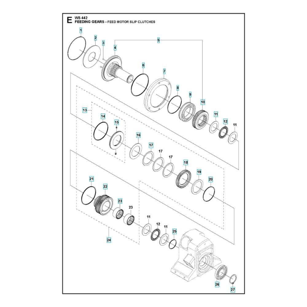 The Gear Assembly for the Husqvarna WS 442 HF Wall Saw is crucial for optimal cutting performance. This assembly includes components such as gears, shafts, and bearings, ensuring smooth operation and precision in demanding cutting tasks. Designed for durability and efficiency, it helps maintain the saw's reliability and longevity.