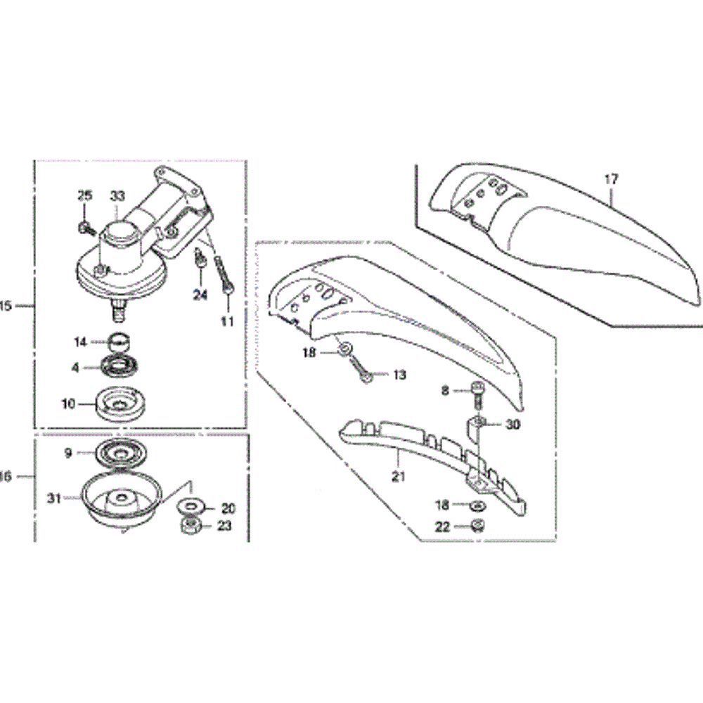 The Gear Case and Guard Assembly for Honda UMK435UE Brushcutters includes essential components to ensure optimal performance and safety. This assembly helps protect the brushcutter's gear system while providing a robust guard for user safety during operation. Genuine Honda parts ensure compatibility and reliability, maintaining the machine's efficiency and longevity.