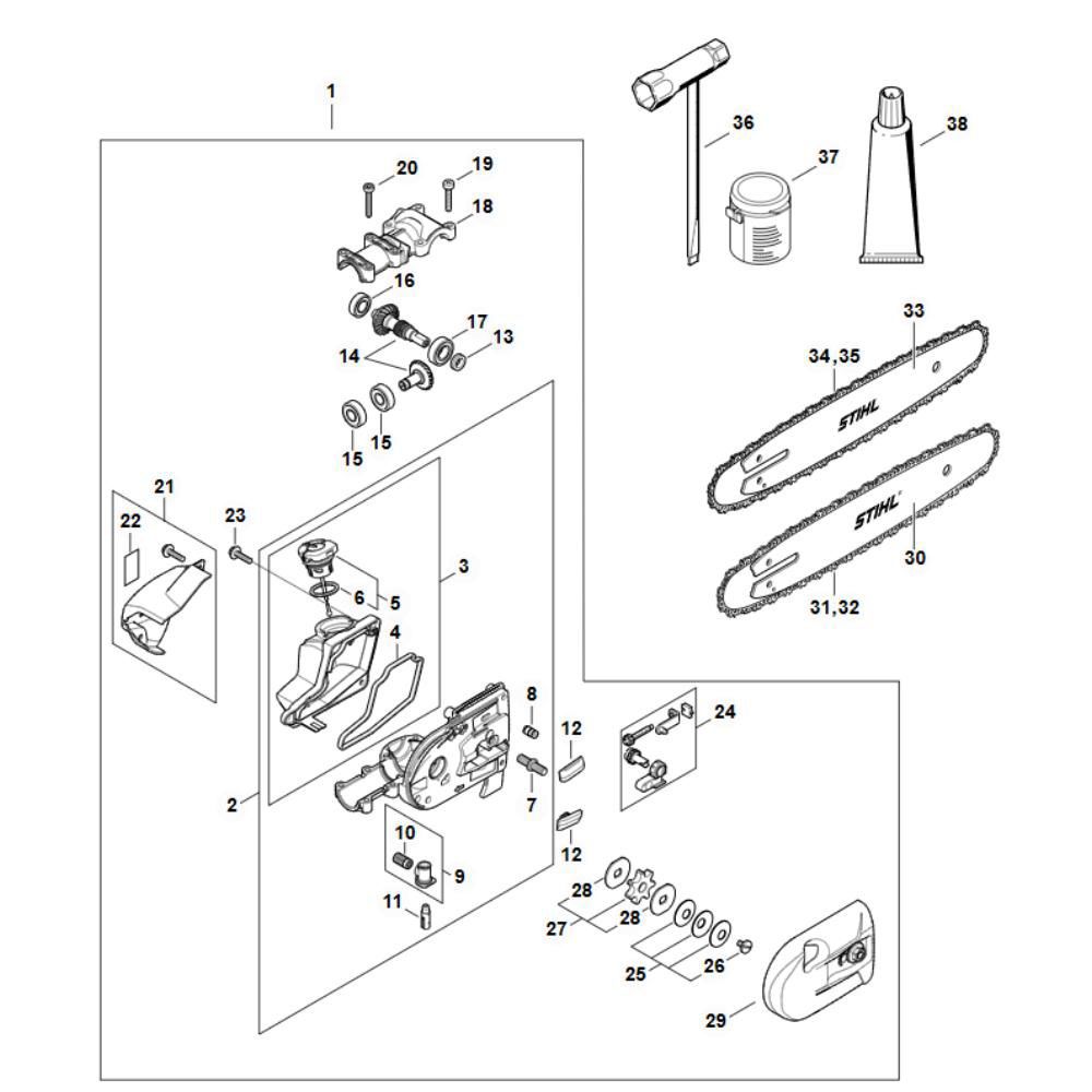 The Gear Head Assembly for the Stihl HT 134 Pole Pruner is a crucial component ensuring efficient operation. This genuine Stihl part facilitates the smooth transfer of power from the engine to the cutting head, enhancing performance and durability. It includes key elements such as gears, shafts, and bearings, designed to withstand the demands of regular pruning tasks.
