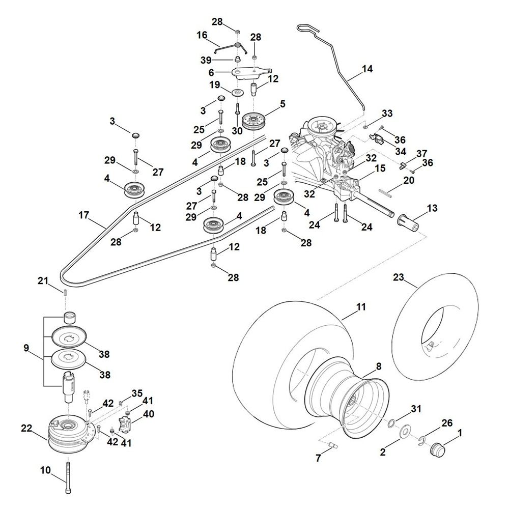 The Gearbox, Rear Wheel, and Blade Clutch assembly for the Stihl RT 6127.1 ZL Ride on Mower ensures optimal performance and longevity. These components are crucial for smooth operation, providing reliable power transmission and control. Genuine Stihl parts are available to maintain the efficiency and durability of your mower, with options for different sizes and specifications.