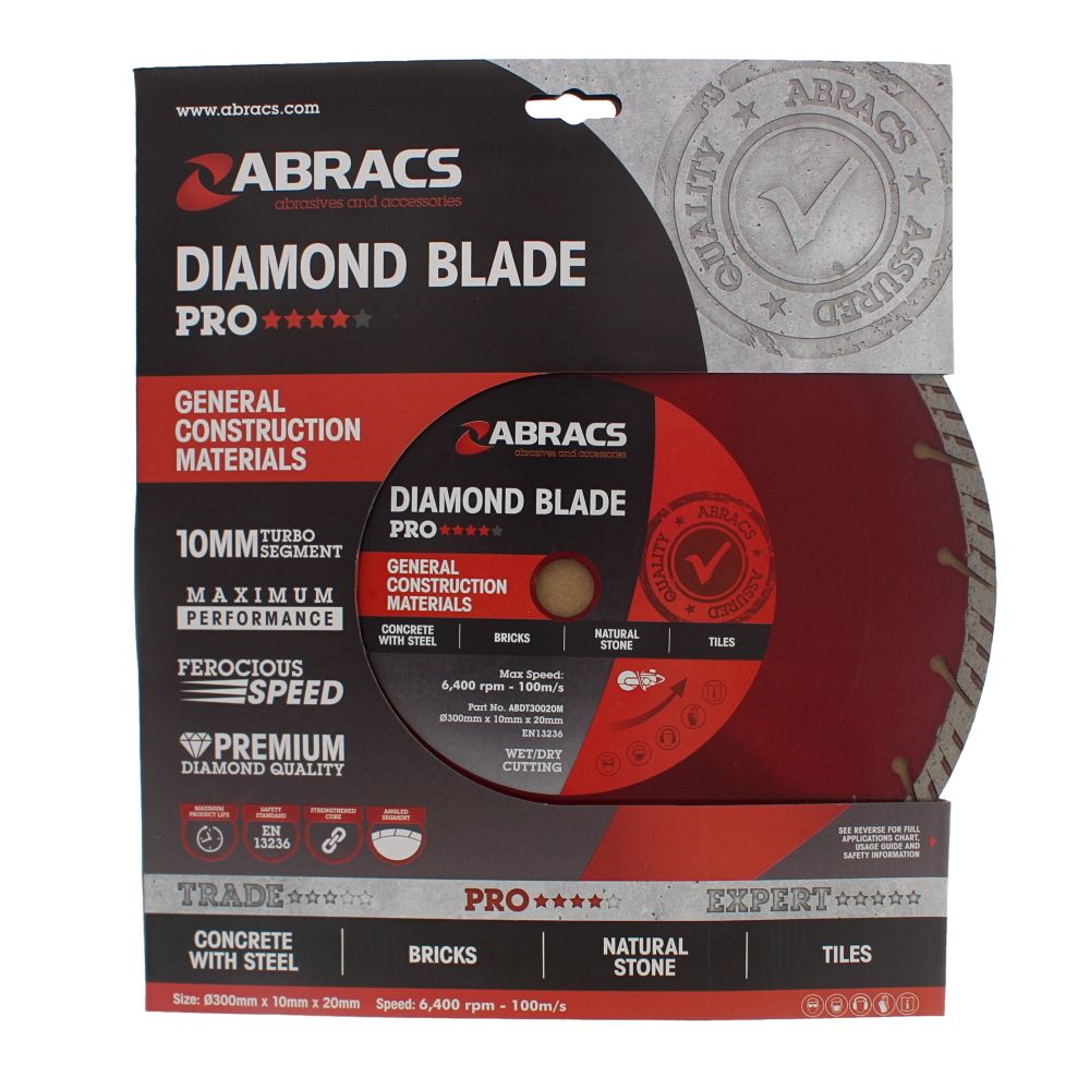 The Abracs General Purpose Turbo 12" (300mm) Diamond Cutting Blade is a genuine replacement blade for handheld cut-off saws and disc cutters. Built with a reinforced steel core and high-quality bonded diamond turbo segments, it delivers fast, accurate cuts with dependable service life. The 12 inch (300 mm) diameter and 20 mm bore (hole centre) make it straightforward to fit to many popular machines, including the DPC6200 and TS410. Its 10 mm angled turbo segments aid cutting speed, while narrow gullets help reduce the risk of segment loss. Suitable for a wide range of site materials, it offers consistent results for trades and DIY work where clean, controlled cutting is required.