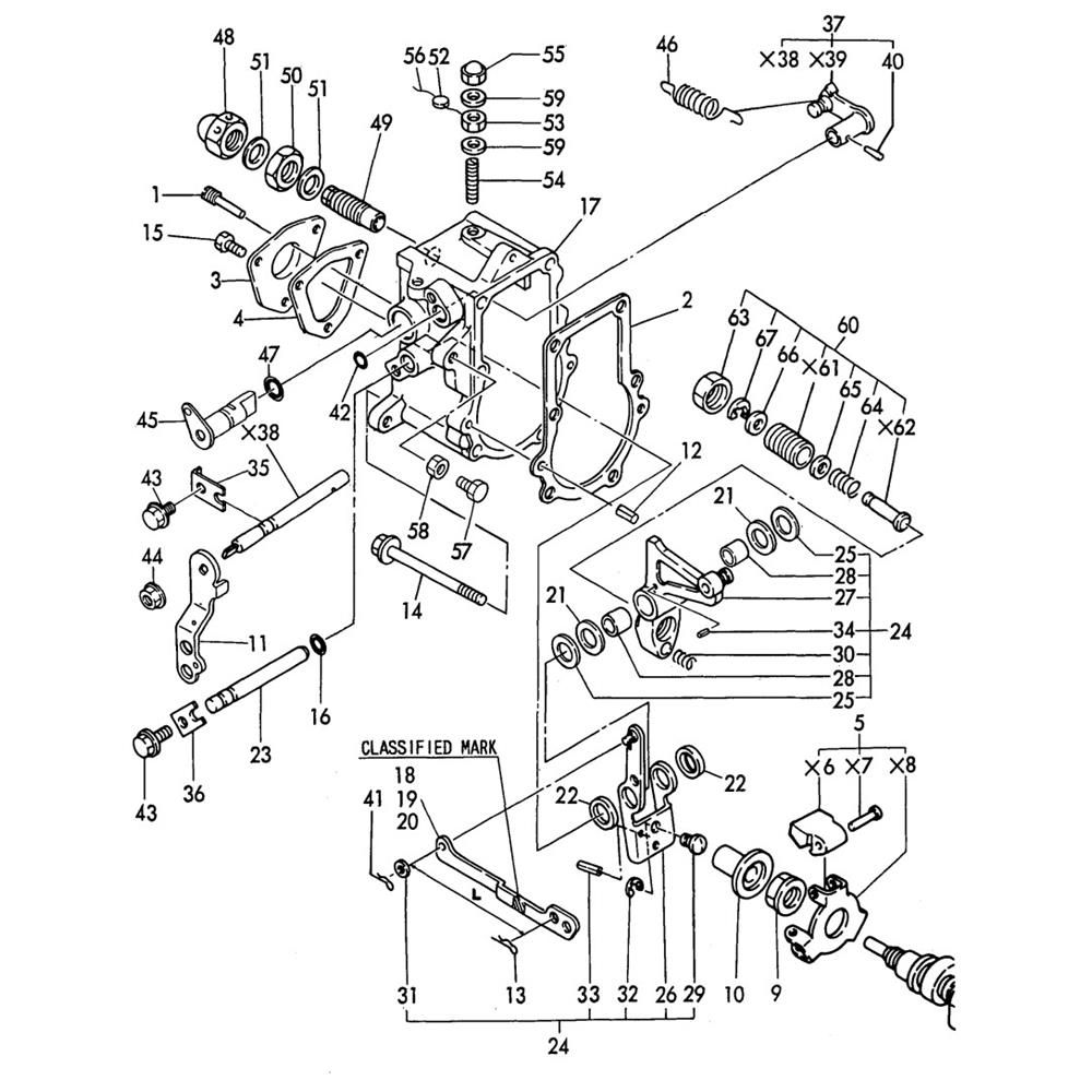 The Governor Assembly for the Yanmar 2TN66E-YL Engine is crucial for regulating engine speed and ensuring optimal performance. This assembly includes components such as springs, levers, and weights, which work together to maintain consistent engine operation. Designed for durability and precision, these genuine Yanmar parts help in reducing wear and extending engine life.