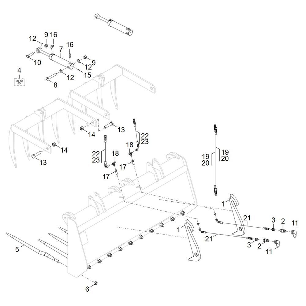 The Grab Bucket Attachment for the Wacker TH522 Telehandler is designed to enhance the machine's versatility in handling materials. This assembly includes components such as hydraulic cylinders, mounting brackets, and grab arms, ensuring efficient operation. Ideal for construction and agricultural tasks, it allows for secure and precise material handling.
