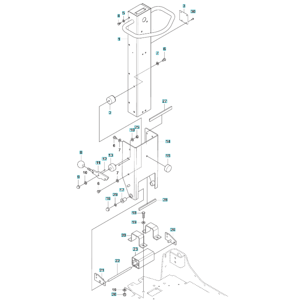 The Handle Assembly for the Husqvarna LG 504 Reversible Compactor is designed to ensure optimal control and manoeuvrability. This assembly includes components that contribute to the effective operation of the compactor, such as grips, levers, and fasteners. It is essential for maintaining the performance and safety of the machine during use.