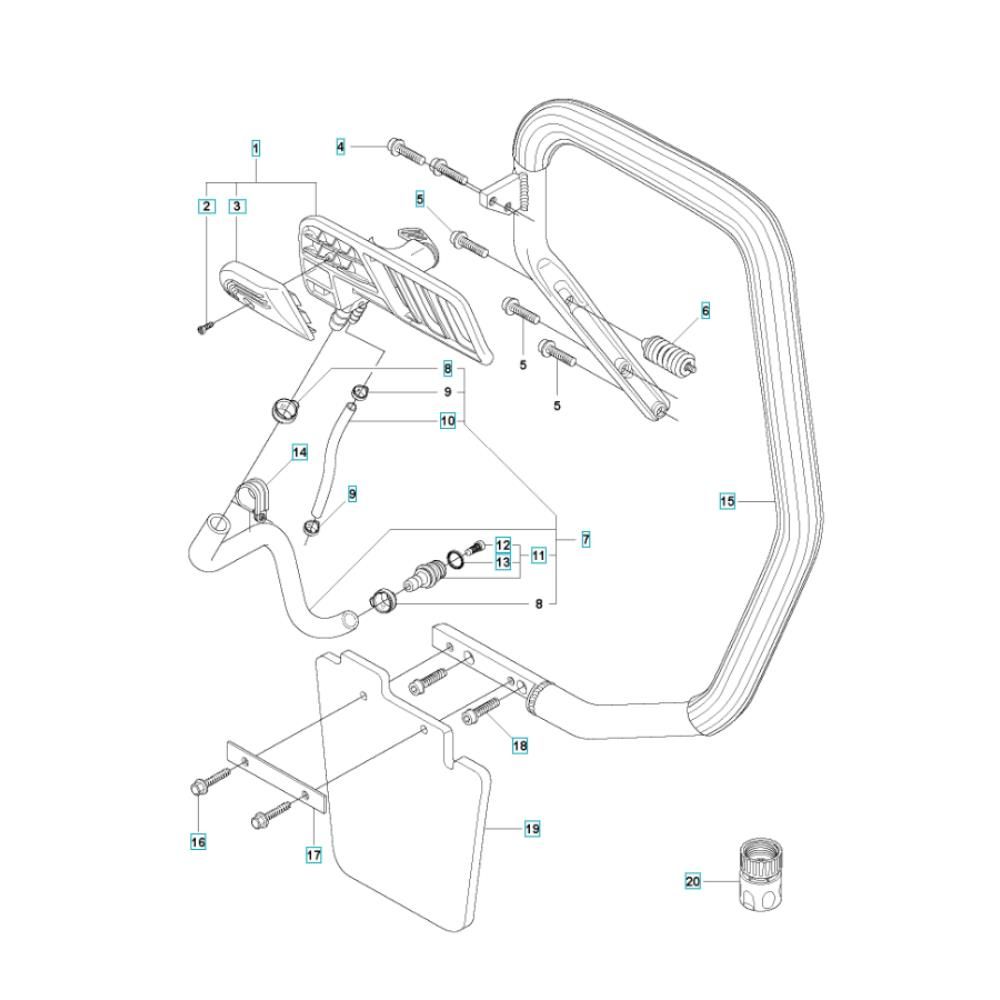 The Handle Assembly for the Husqvarna K950 Chain Concrete Cutter is designed to provide stability and control during operation. This assembly includes essential components such as grips, brackets, and fasteners, ensuring a secure and comfortable handling experience. Ideal for maintaining the performance and safety of your concrete cutter, this assembly is crucial for effective cutting tasks.