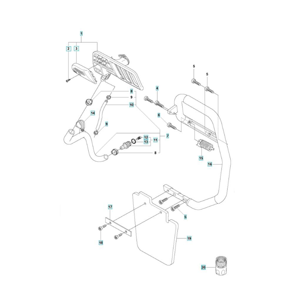 The Handle Assembly for the Husqvarna K970 Chain Concrete Cutter is designed to provide stability and control during cutting operations. This assembly includes components such as grips, brackets, and fasteners, ensuring a secure and comfortable handling experience. Essential for maintaining precision and safety, it is suitable for various construction and demolition tasks.