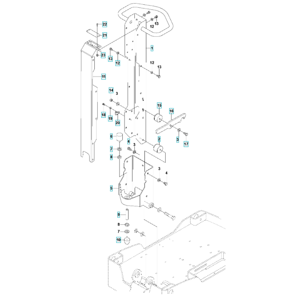 The Handle Assembly for the Husqvarna LG 400 Diesel Reversible Compactor is designed to ensure optimal control and ease of use. This assembly includes components such as grips, levers, and brackets, which are essential for maintaining the machine's functionality. It is a crucial part for operators seeking reliable performance in compacting tasks.