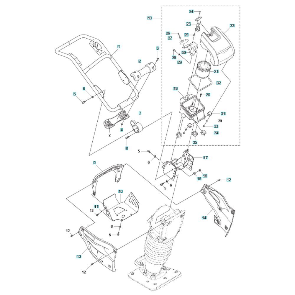 The Handle Assembly for the Husqvarna LT 6005 H Trench Rammer is designed to ensure optimal control and comfort during operation. This assembly includes components such as grips, levers, and brackets, which are essential for maintaining the machine's functionality and ease of use. Genuine Husqvarna parts ensure compatibility and reliability, enhancing the performance of your trench rammer.