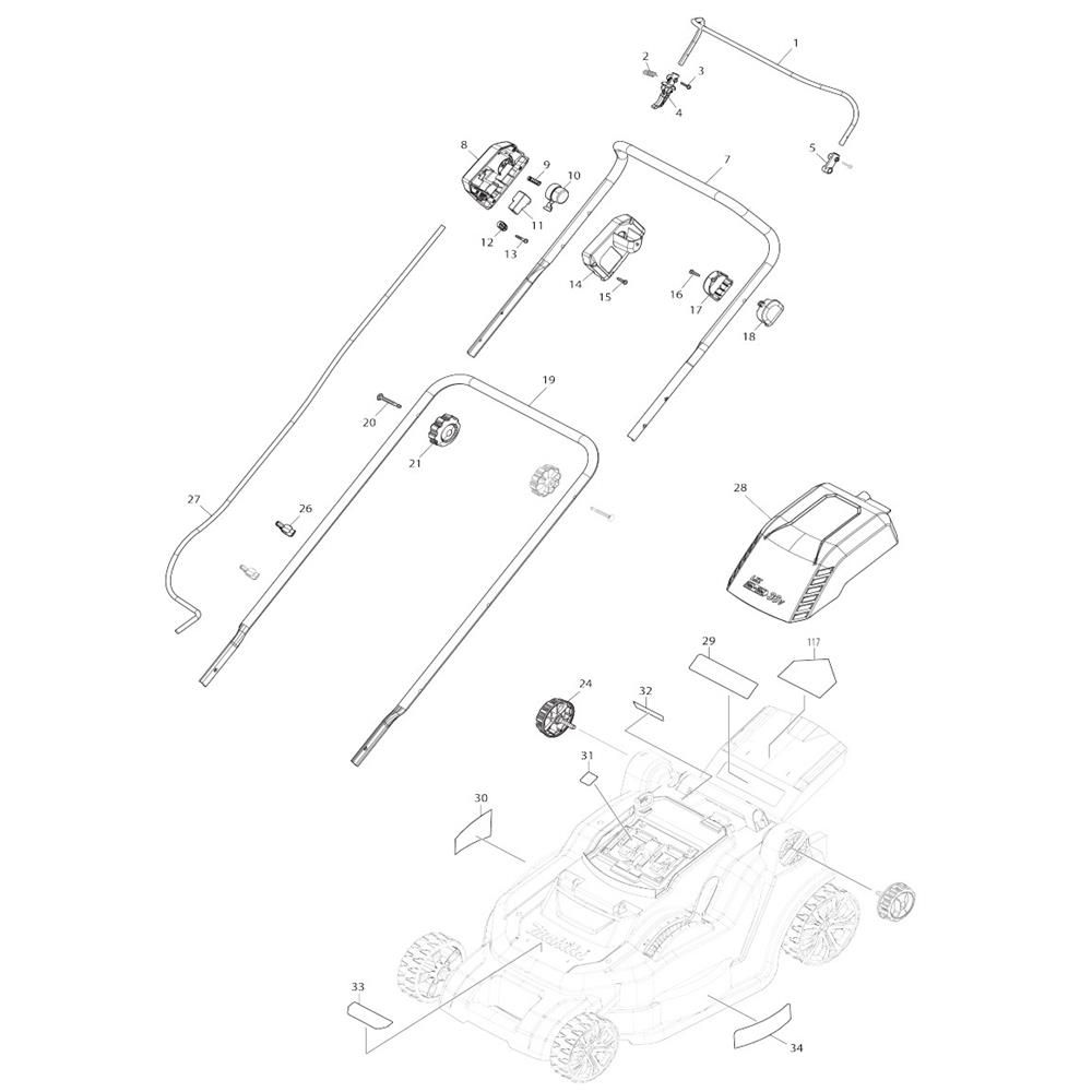 The Handle Assembly for the Makita DLM432 Mower is designed to ensure comfortable and efficient operation of your cordless lawnmower. This assembly includes components such as grips, levers, and brackets, providing a secure and ergonomic handling experience. Essential for maintaining the mower's usability and performance, it is available in various configurations to suit different user needs.