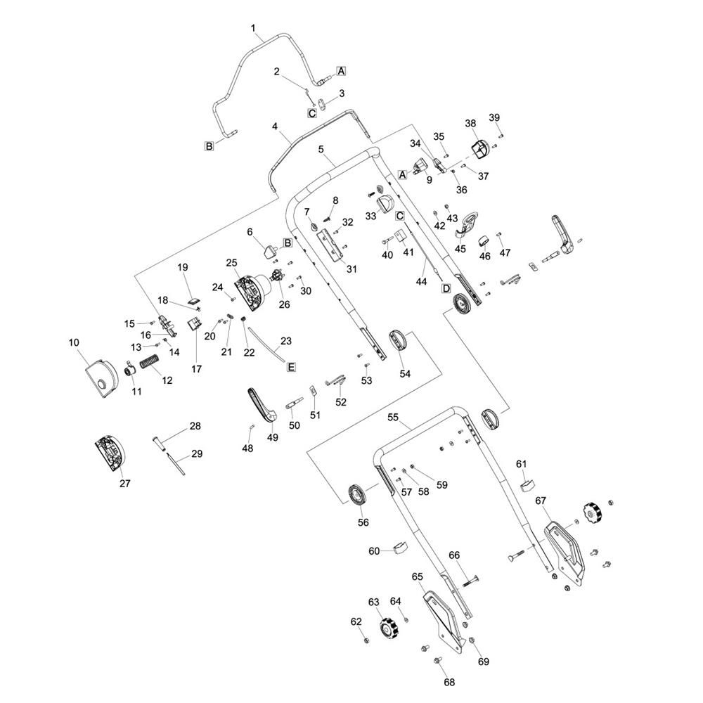 The Handle Assembly for the Makita ELM4613 Mower is designed to ensure comfortable and efficient operation. This assembly includes essential components such as grips, levers, and brackets, contributing to the mower's overall functionality and ease of use. Genuine Makita parts ensure compatibility and durability, maintaining the performance of your electric mower.