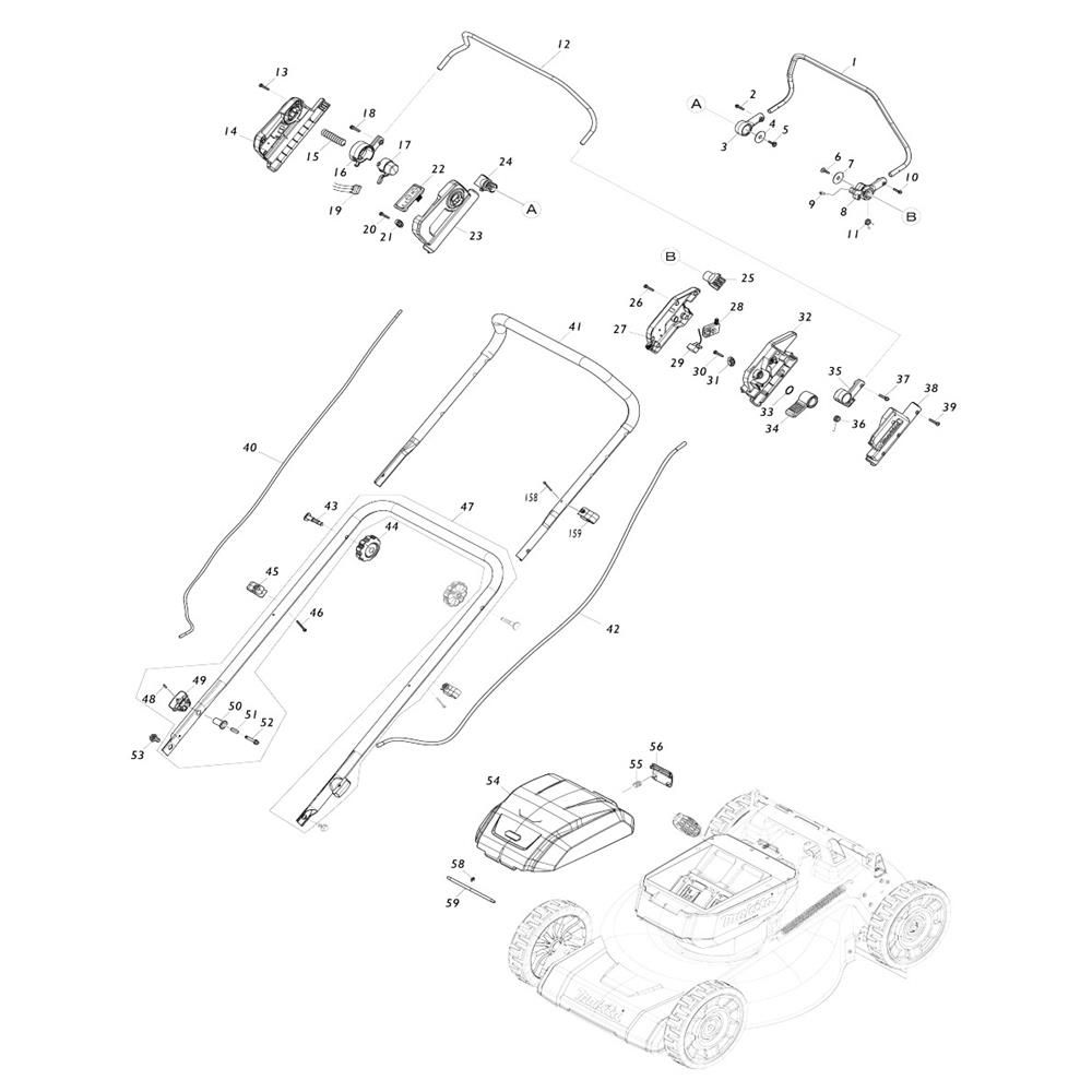The Handle Assembly for the Makita LM004J Cordless Mower includes essential components for secure and comfortable operation. Designed to fit the Makita LM004J model, this assembly ensures optimal control and manoeuvrability during mowing tasks. Components may include grips, levers, and brackets, all contributing to a reliable and efficient mowing experience.