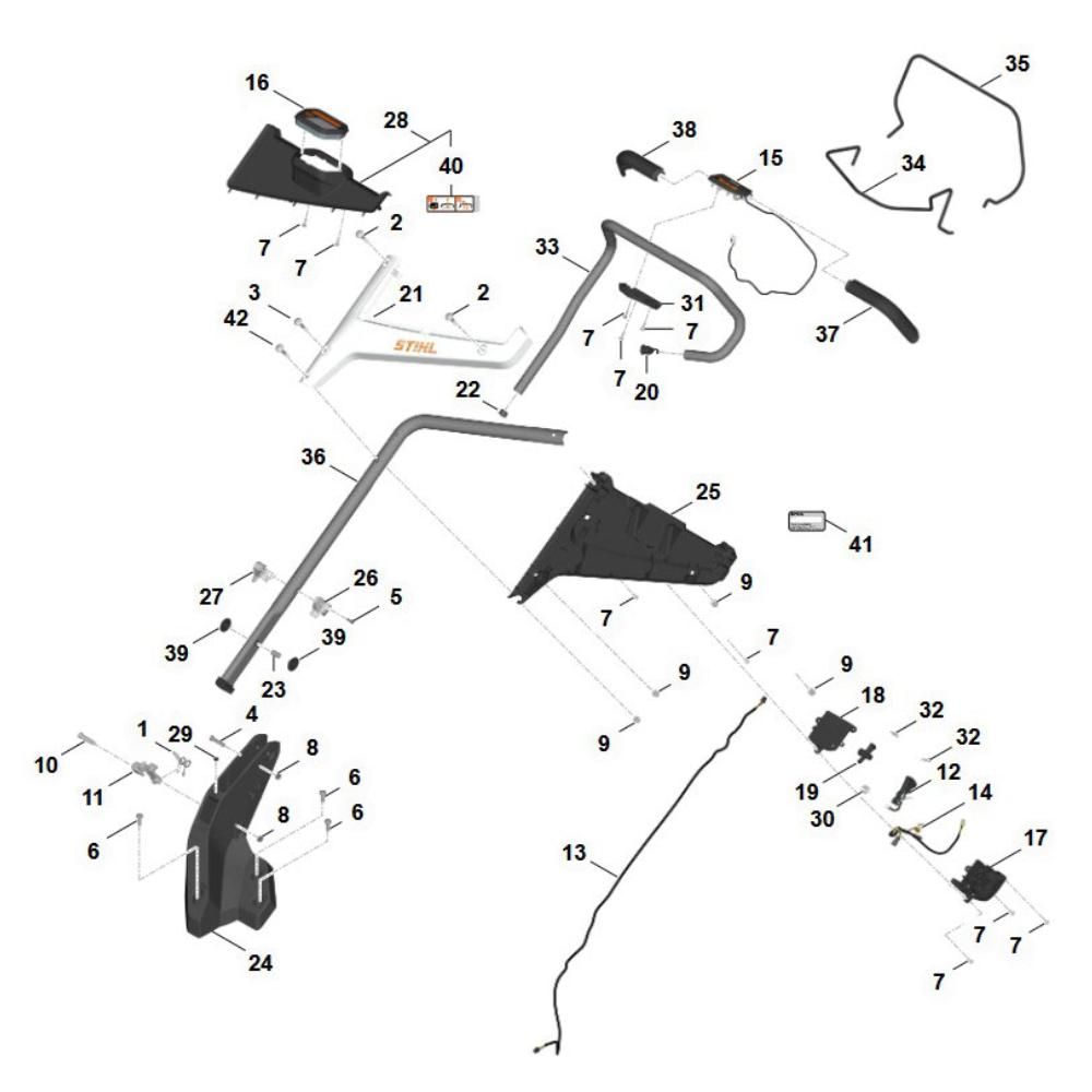 The Handle Assembly for the Stihl RMA 7.0 RV Lawn Mower is a genuine Stihl part designed to ensure optimal control and comfort during mowing. This assembly includes components such as grips, levers, and brackets, which are essential for maintaining the mower's functionality and ease of use. Suitable for routine maintenance and replacements.