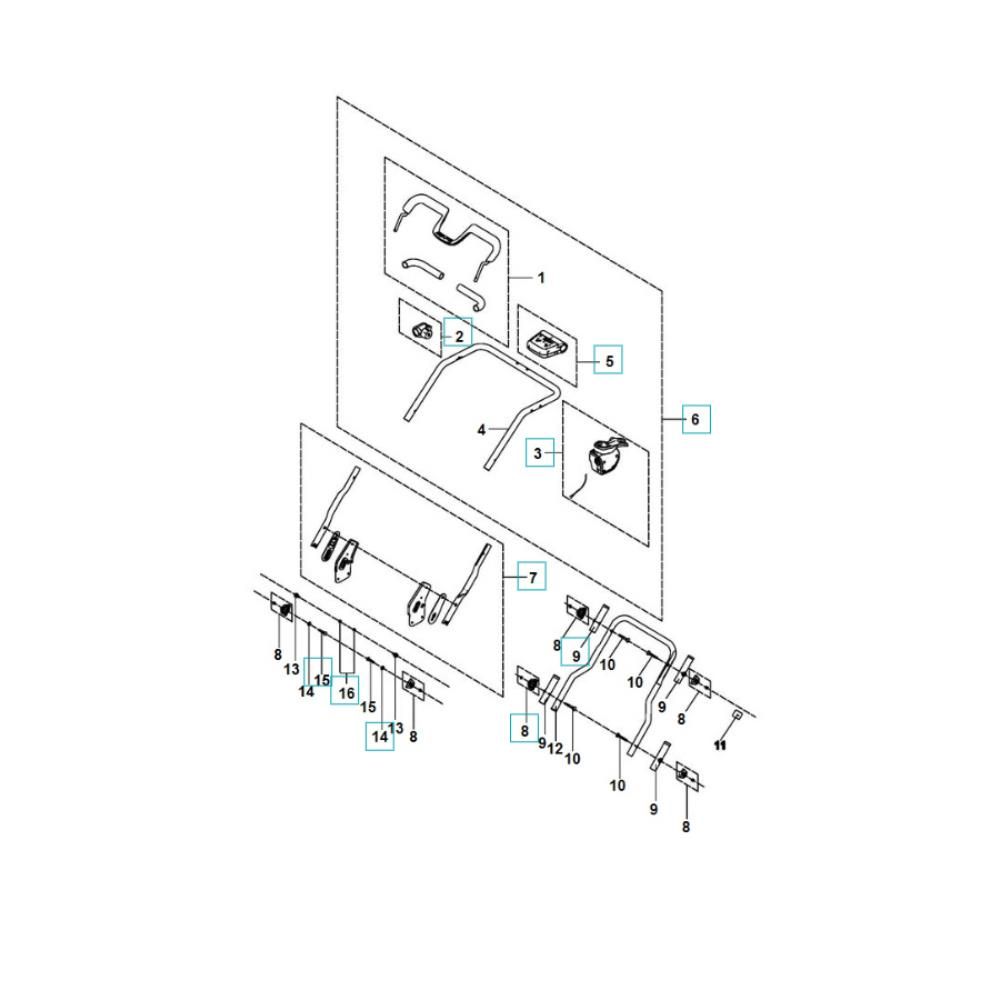 The Handle, Controls Assembly for the Husqvarna S 138i Scarifier includes key components for effective operation and user control. Designed to ensure precise handling and ease of use, this assembly is crucial for maintaining the scarifier's performance. Components typically include handles, levers, and control cables, all crafted to fit seamlessly with the Husqvarna S 138i model.