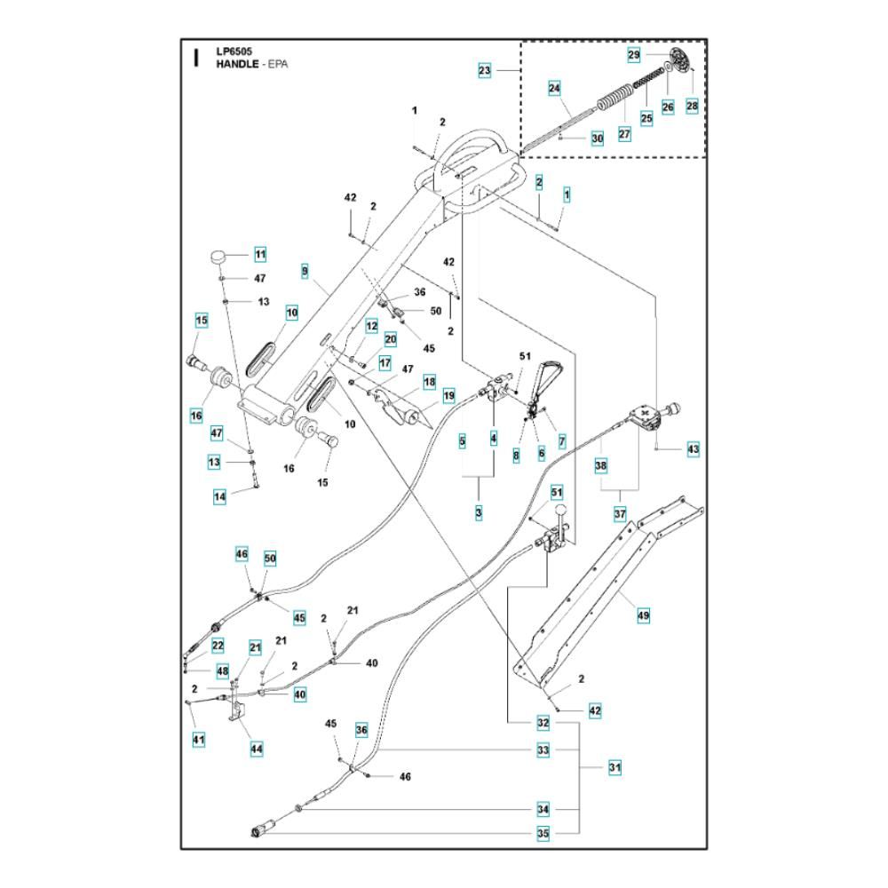 The Handle EPA Assembly for the Husqvarna LP 6505 Roller is designed to ensure optimal control and comfort during operation. This assembly includes key components such as grips, levers, and brackets, which are essential for maintaining the roller's performance and ease of use. Genuine Husqvarna parts ensure compatibility and reliability, enhancing the machine's longevity.