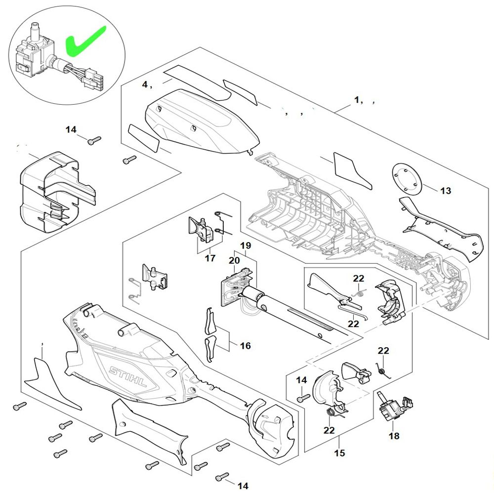 The Handle Housing Cover for the Stihl HLA 66 Hedge Trimmer is a genuine part designed to protect and encase the handle mechanism. This cover ensures the durability and safety of the trimmer's handle, maintaining its functionality and comfort during use. Suitable for models with serial number 443397592, it is essential for routine maintenance and repair.