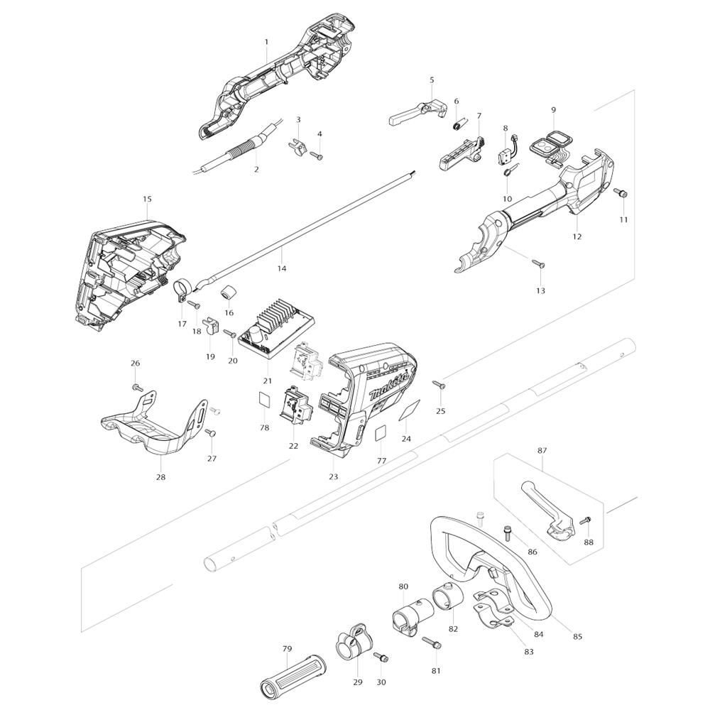 The Handle, Housing, Lever Assembly for the Makita DUR368L Cordless Trimmer includes essential components for maintaining optimal performance. This assembly ensures secure handling and efficient operation, featuring genuine Makita parts. It is designed to support the trimmer's functionality by providing robust housing and precise control through the lever mechanism.