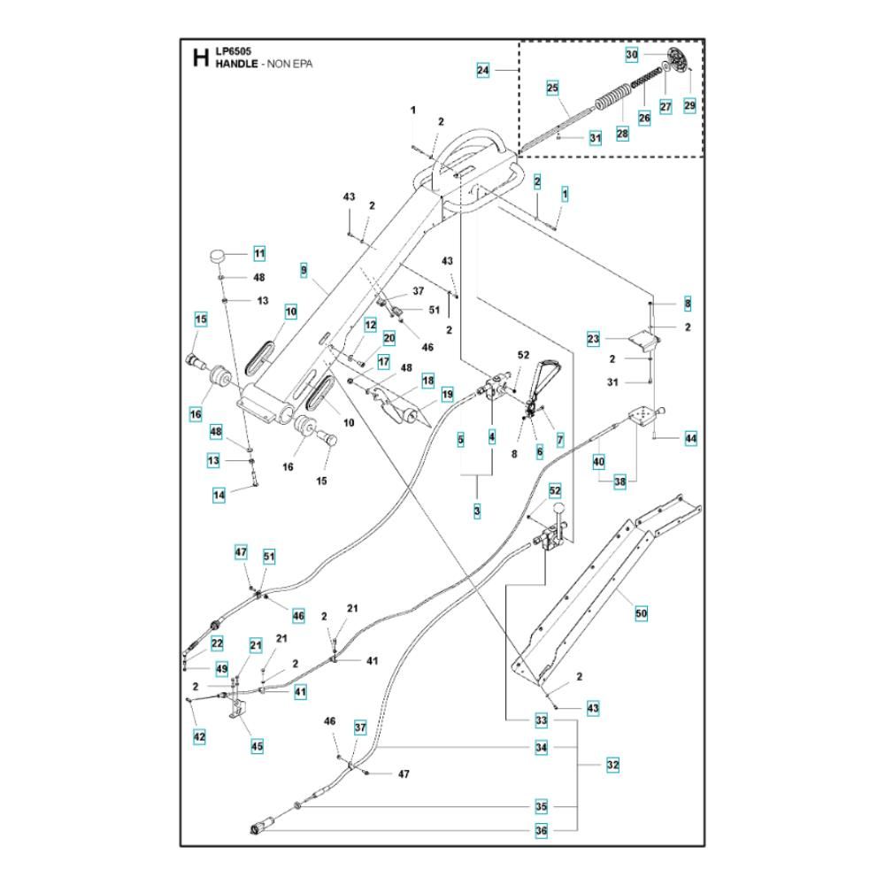 The Handle Non-EPA Assembly for the Husqvarna LP 6505 Roller is designed to ensure optimal control and manoeuvrability. This assembly includes key components such as grips, levers, and brackets, essential for maintaining the roller's performance. Genuine Husqvarna parts ensure compatibility and durability, supporting effective operation in various construction tasks.