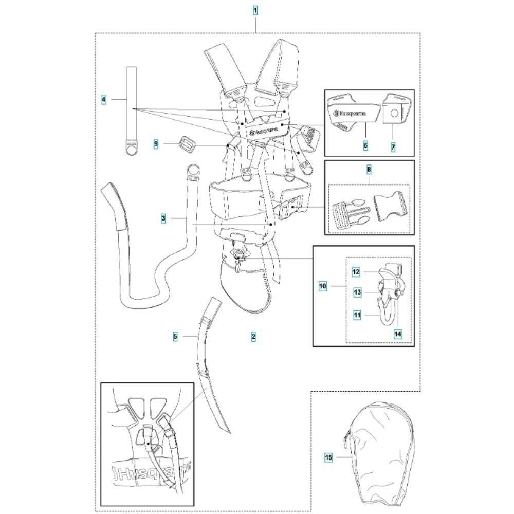 The Harness Assembly for the Husqvarna 545F Brushcutter is designed to provide optimal support and comfort during extended use. This assembly includes genuine Husqvarna parts, ensuring compatibility and durability. It helps distribute weight evenly, reducing strain on the user. Components may include straps, buckles, and padding, all tailored for the 545F model.