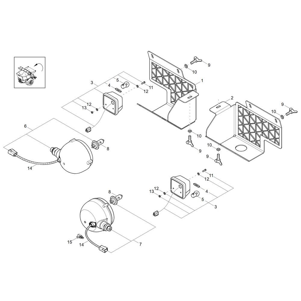 The Headlight Assembly for the Wacker DW20-2 Dumper is designed to ensure optimal visibility and safety during operation. This assembly includes components such as bulbs, lenses, and housing, providing reliable illumination in various working conditions. Essential for maintaining the performance and safety of your Wacker Neuson Dumper.