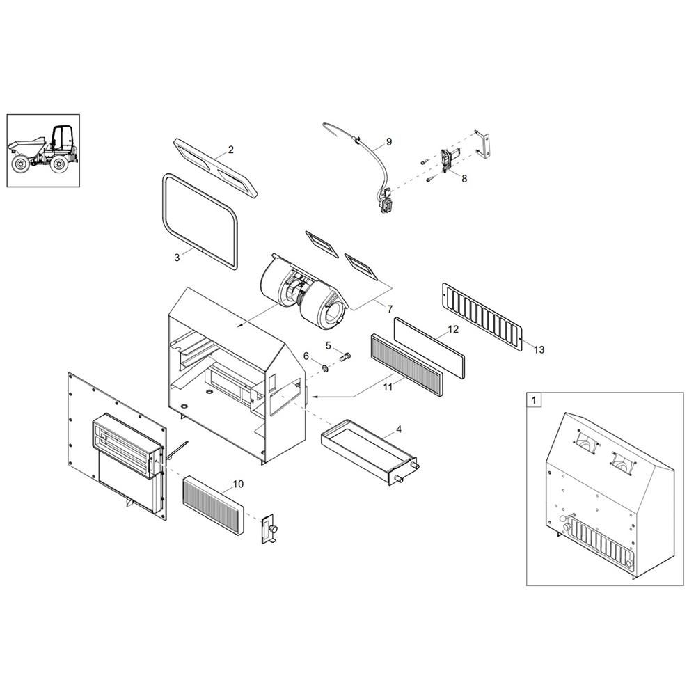 The Heating Assembly for the Wacker DV100-2 Dumper is designed to ensure optimal temperature control and comfort during operation. This assembly includes components such as heating elements, ducts, and controls, which work together to maintain a warm environment in the cab. Essential for cold weather operations, it helps enhance operator efficiency and safety.
