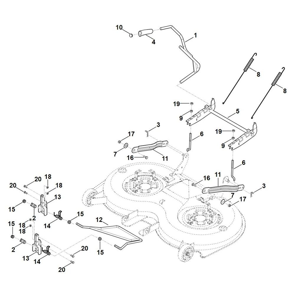 The Height Adjustment for the Stihl RT 6127.1 ZL Ride on Mower ensures precise cutting performance by allowing users to modify the cutting height to suit different grass conditions. This assembly includes components such as levers, springs, and brackets, which work together to provide smooth and reliable height adjustments. Essential for maintaining optimal lawn care, these parts are genuine Stihl replacements.