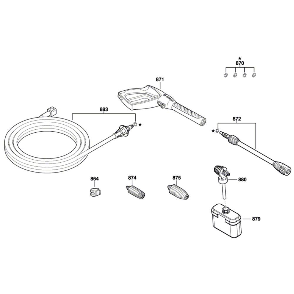 The High Pressure Cleaner Assembly for Bosch AdvancedAquatak 140 includes essential components to ensure optimal performance and longevity. Designed for efficient cleaning, this assembly helps maintain the machine's effectiveness by providing genuine Bosch spare parts. Typical components include hoses, nozzles, and connectors, all crucial for reliable operation.