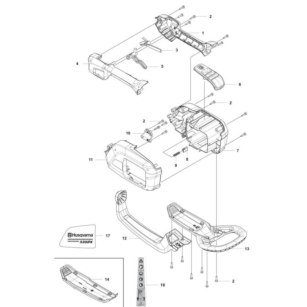 The Housing Assembly for Husqvarna 530iPX Pole Pruners includes essential components to maintain the structural integrity and functionality of the pruner. Designed for durability, it ensures the protection of internal mechanisms from external elements. Typical parts include covers, fasteners, and seals, all contributing to the pruner's efficient operation.