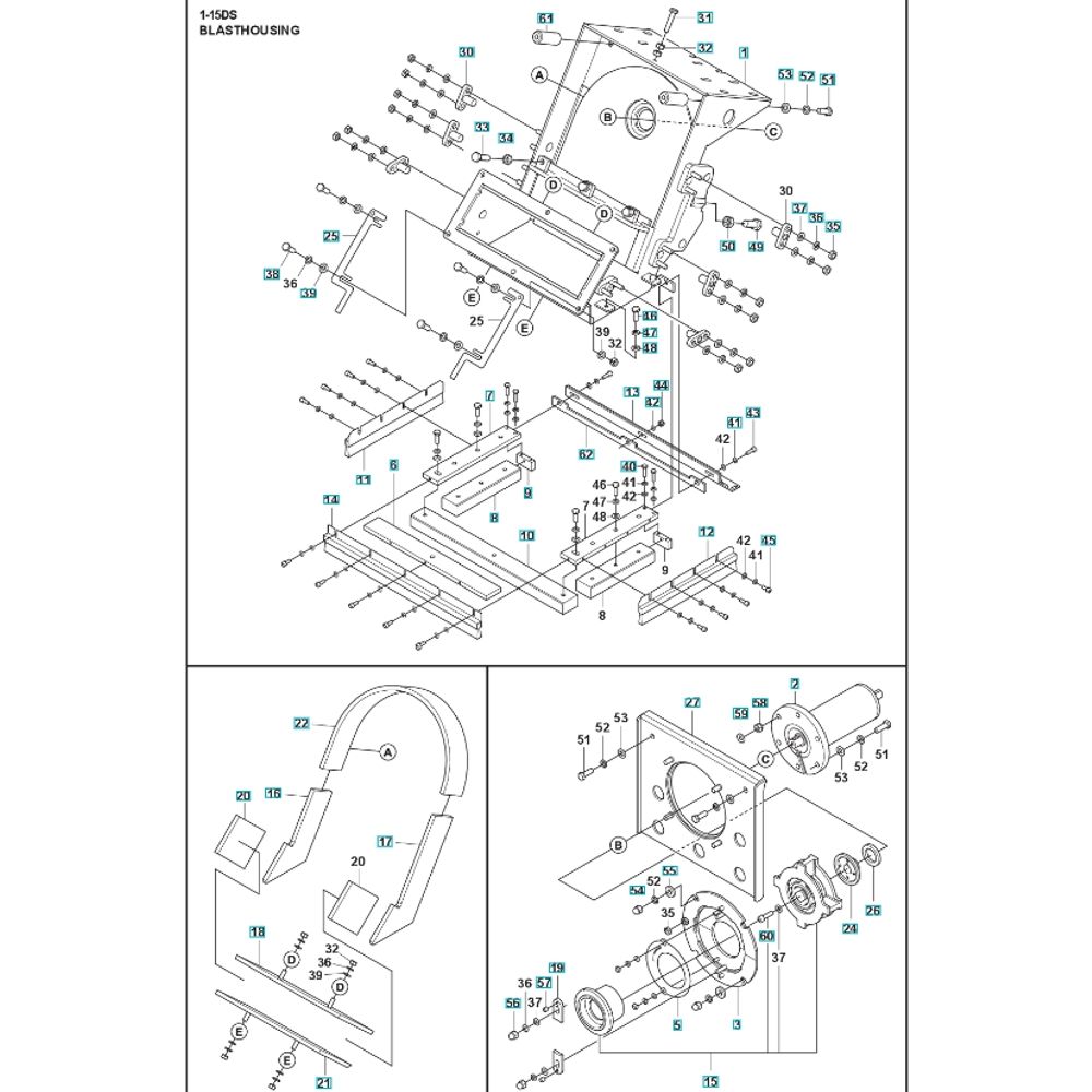 The Housing Assembly for the Husqvarna BLASTRAC 1-15DS Concrete Shot Blaster is essential for maintaining the machine's integrity and performance. This assembly includes components that protect and support the blaster's operational parts, ensuring efficient and reliable use. Genuine Husqvarna spare parts are available to fit various needs, enhancing durability and functionality.