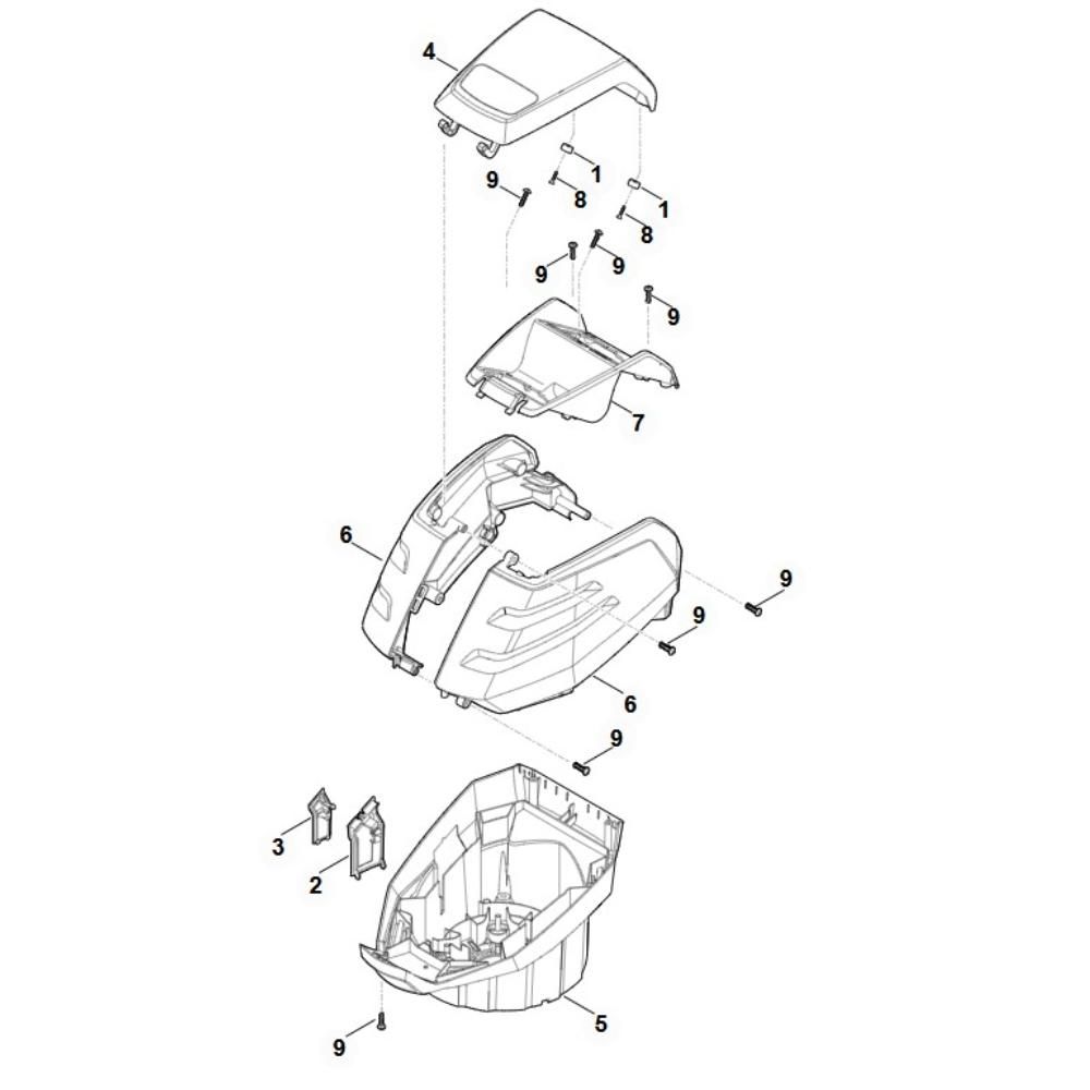 The Housing Assembly for the Stihl MVP 600.1 Cordless Powerhead is a genuine Stihl part designed to protect and support the internal components of the powerhead. This assembly ensures the structural integrity and optimal performance of the machine. It includes various components such as covers, fasteners, and seals, essential for maintaining the powerhead's durability and efficiency.
