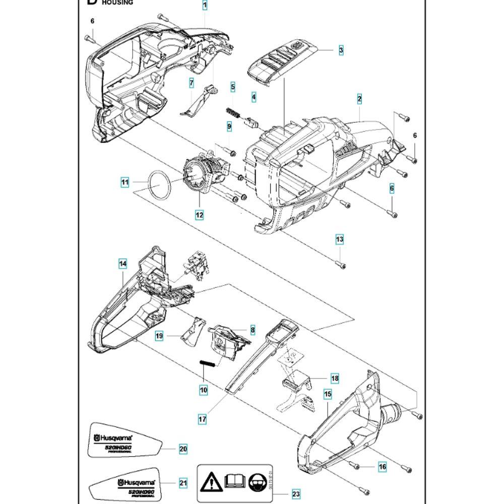 Housing equipment for the Husqvarna 520iHD60 Hedgetrimmer includes essential components to ensure optimal performance and longevity. Designed for precise fitting and durability, these genuine spare parts help maintain the structural integrity of the hedgetrimmer. Components such as casings, covers, and fasteners are available to support routine maintenance and repairs.