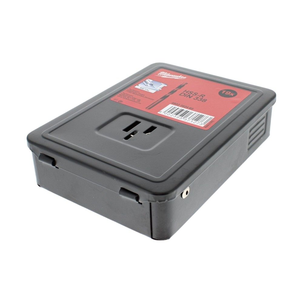 The HSS-R Drill (DIN338) Set - 19 Pieces is a genuine Milwaukee set of roll-forged high-speed steel drill bits designed for accurate, dependable drilling in metal. Each bit is manufactured to DIN 338 standards for consistent quality and performance. The set covers 19 metric sizes from 1 mm to 10 mm, giving good coverage for pilot and clearance holes. A black oxide finish supports smooth swarf evacuation and helps resist surface corrosion. With a 118° standard point and Type N flute geometry, these bits are suited to general-purpose drilling in steel, cast iron, and alloyed or non-alloyed materials up to 800 N/mm2. Compatible with standard three‐jaw chucks on cordless and corded drills or drill presses. Genuine Milwaukee Part, OEM No. 4932352468. Supplied in a robust red case for tidy storage and quick size selection.