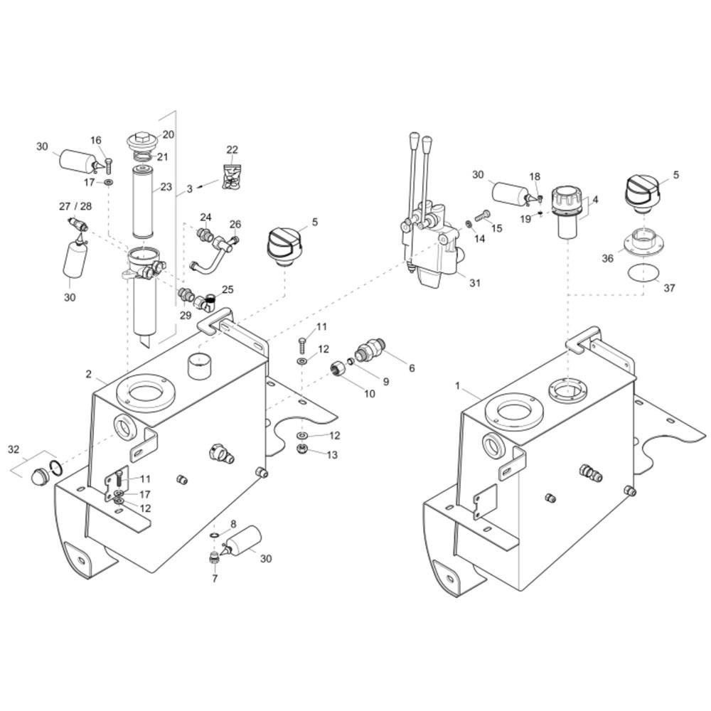 The Hydraulic Tank Assembly for the Wacker 1601 Dumper is essential for maintaining hydraulic fluid storage and system efficiency. This assembly includes components like tanks, hoses, and fittings, ensuring optimal performance and longevity of the dumper. Designed for easy integration, it supports the hydraulic system's functionality, reducing wear and tear on moving parts.