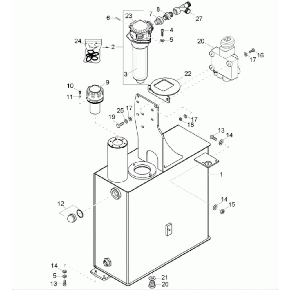 The Hydraulic Tank Assembly for the Neuson 6001 Dumper is crucial for maintaining the machine's power swivel function. This assembly includes components designed to ensure efficient hydraulic fluid storage and distribution, enhancing the dumper's operational reliability. Genuine Wacker Neuson parts are used to guarantee compatibility and performance. Available components may include tanks, fittings, hoses, and seals.