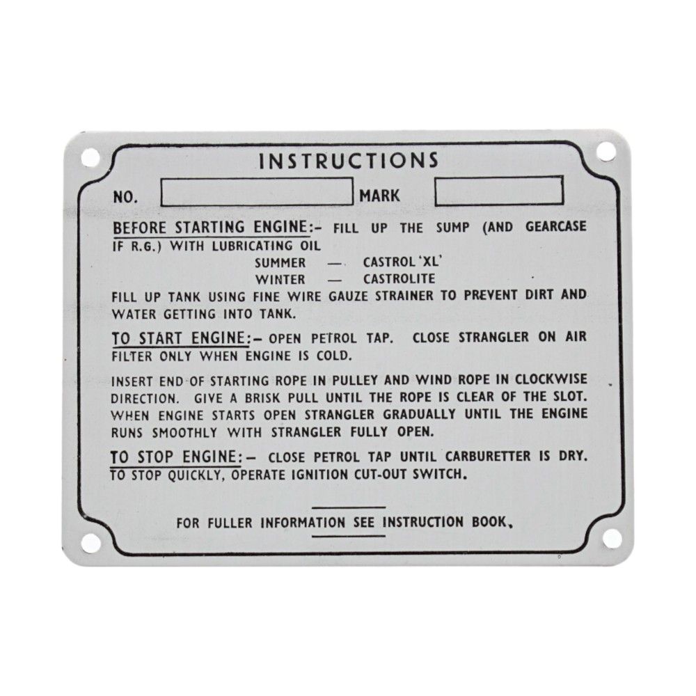 This identification and instruction plate is typically used in Villiers MK10, MK12, and C25 engines. It serves as a crucial component for engine identification and operation, making it an indispensable part for engine restorers and enthusiasts aiming to maintain the authenticity and functionality of their machinery.