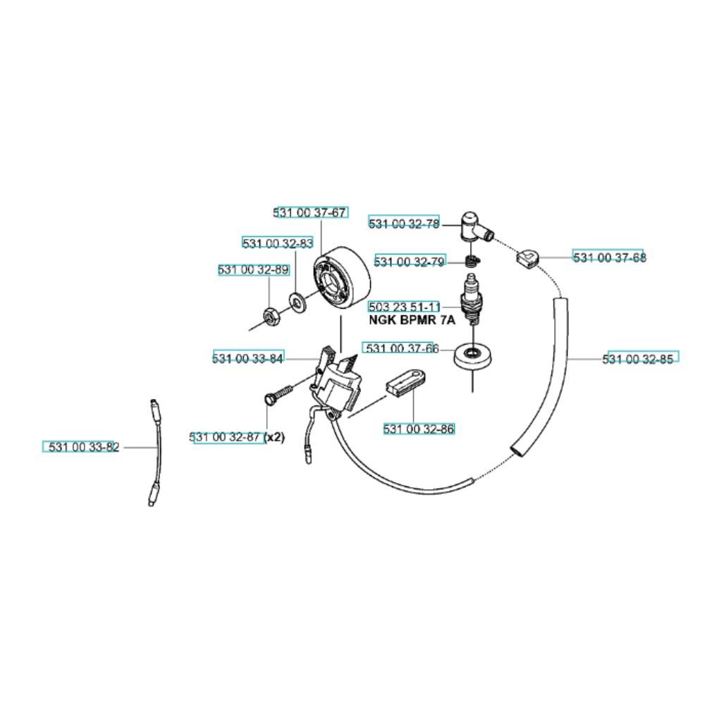 The Ignition System Assembly for the Husqvarna 165 BT Blower ensures efficient engine start and performance. This assembly includes key components such as ignition coils, spark plugs, and wiring harnesses, all designed to deliver reliable ignition and optimal engine function. Regular maintenance of these parts helps in achieving consistent performance and prolonging the blower's lifespan.